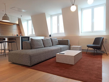 SLIK a pour sa part proposé l'ensemble du mobilier (canapé, fauteuil, tables basses, tapis, tabourets de cuisine, bureau...) et des luminaires ainsi qu'un très beau papier peint. Avec les architectes, nous nous sommes concertés à chaque phase du projet pour une proposition d'ambiance cohérente: choix des matériaux, des tissus, des couleurs...